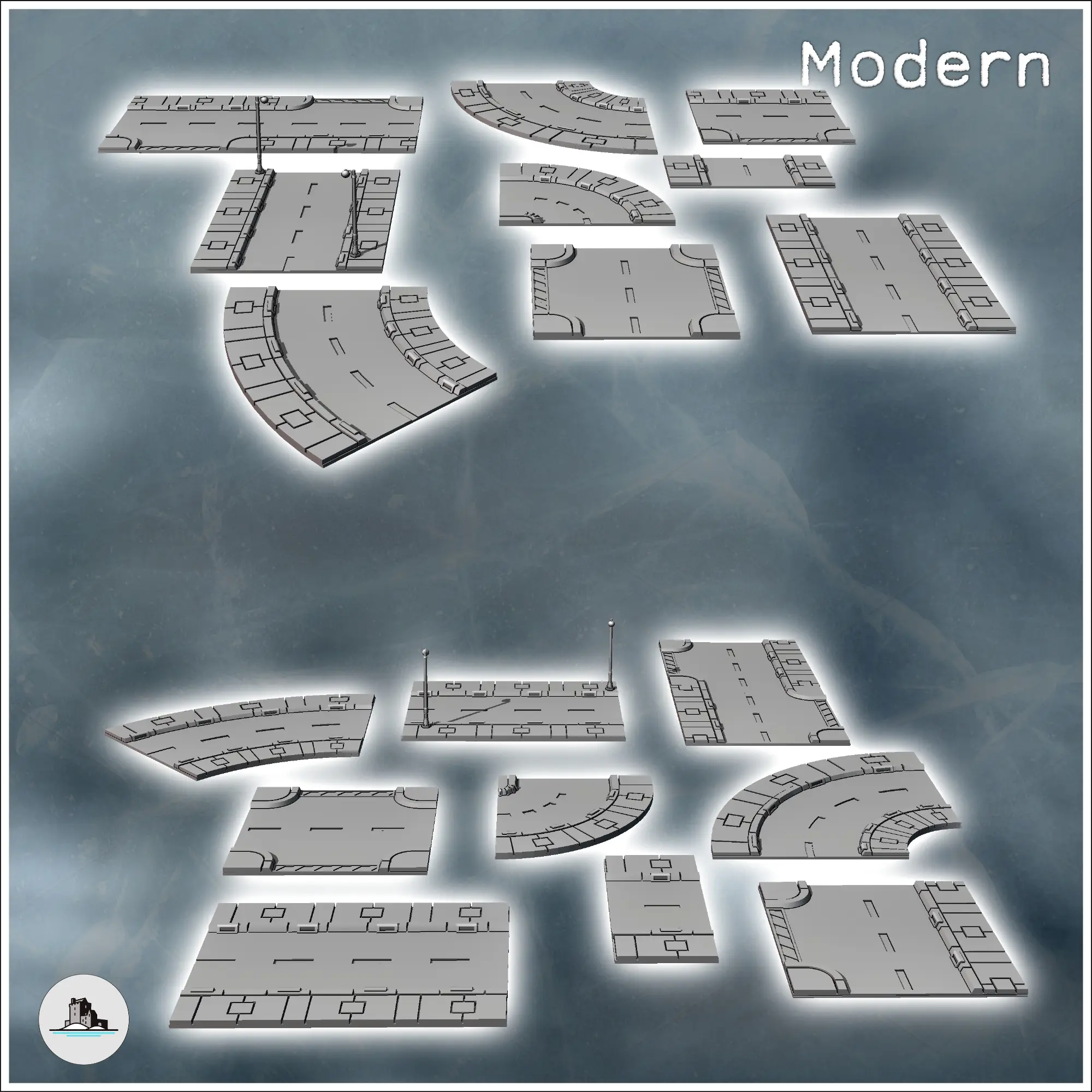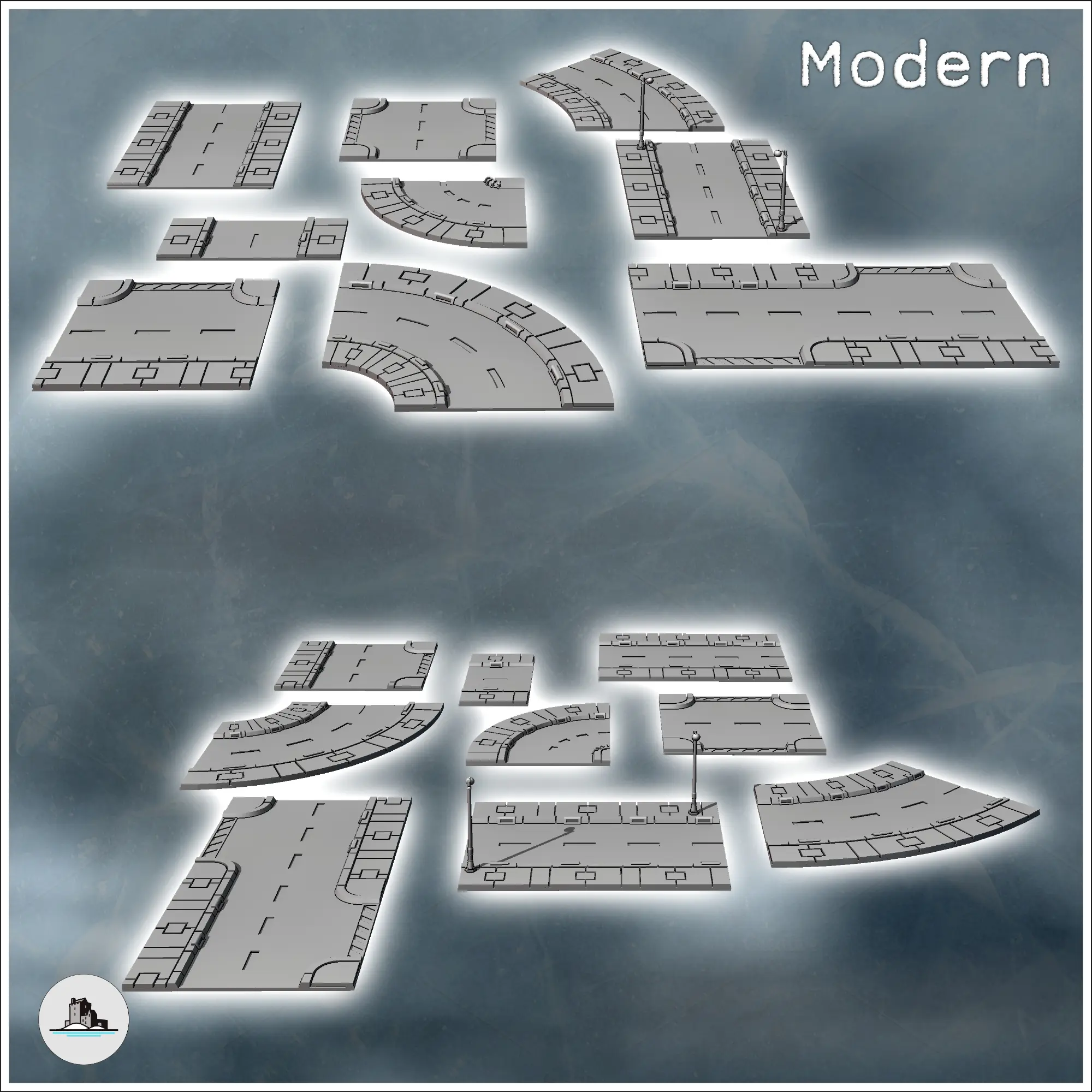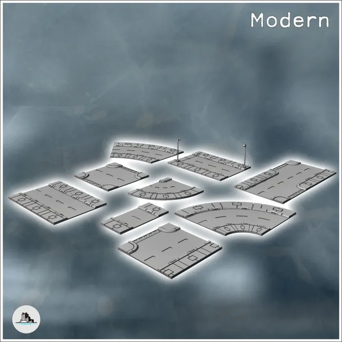 Set of modular modern urban streets with street lamps (6) -