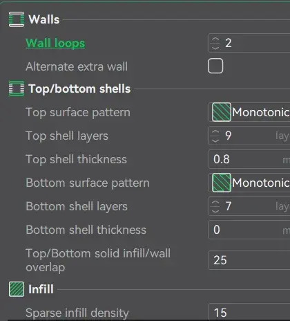 0.08mm layer, 2 walls, 15% infill
